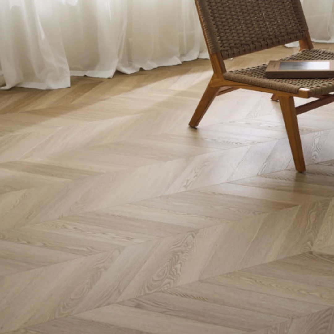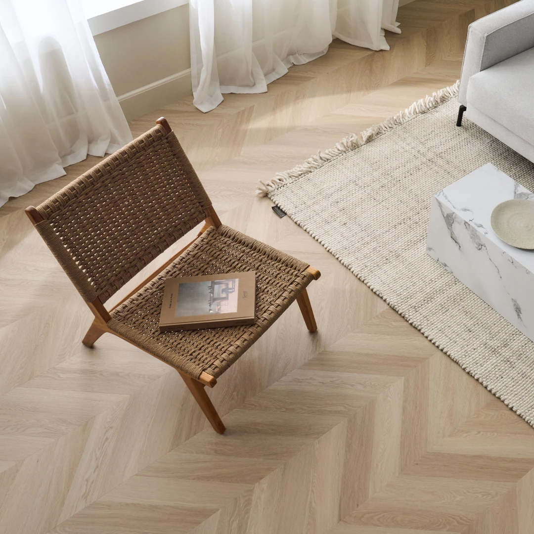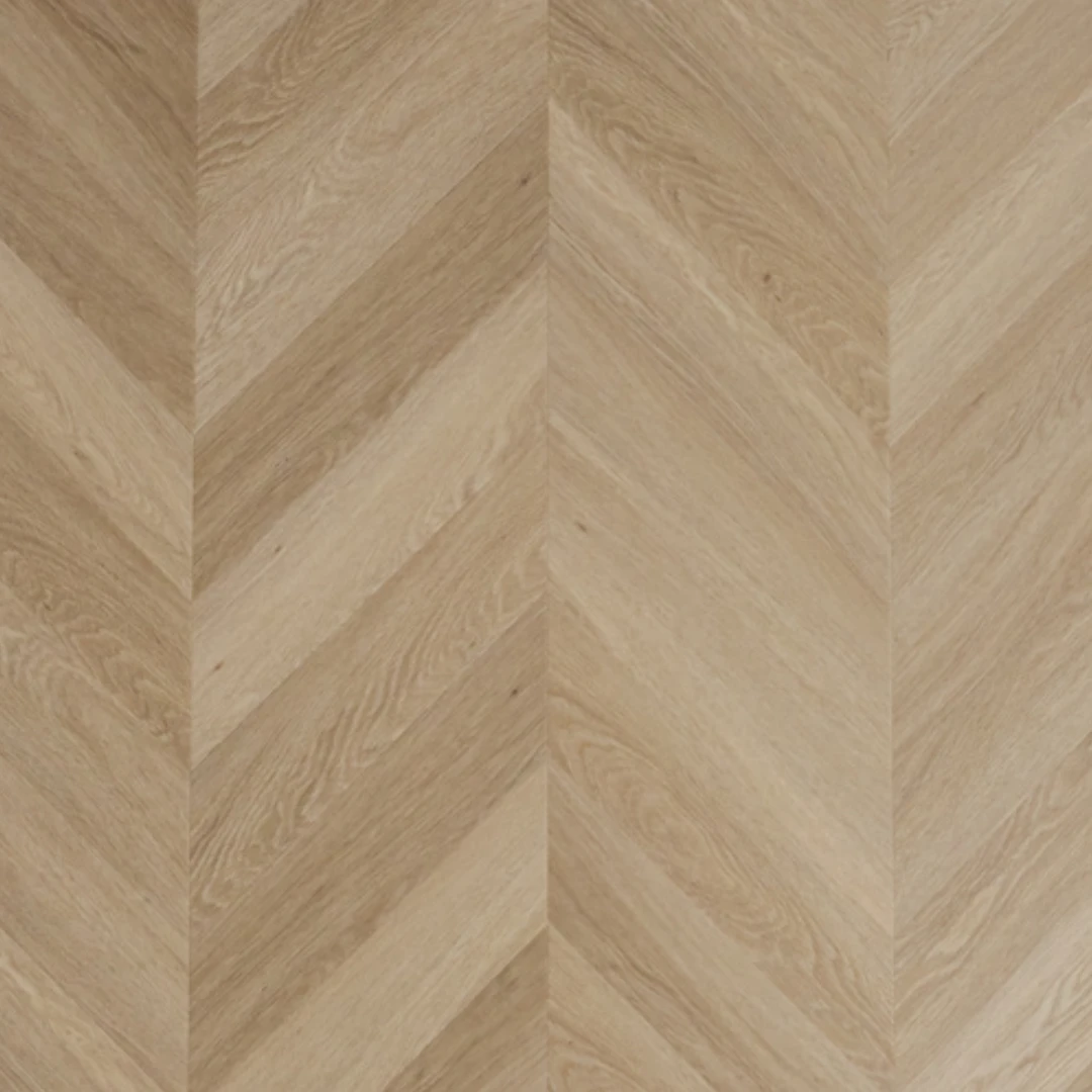 Timberman Novego – Nice, Chevron er en eksklusiv vinylbelægning, der kombinerer stil med funktionalitet. Denne type gulvbelægning er designet med et flot chevron mønster (fransk sildeben), der giver et elegant og tidløst udtryk i ethvert rum. Materialet er yderst holdbart og modstandsdygtigt over for slid, hvilket gør det ideelt til både private hjem og kommercielle miljøer. Belægningen er 100% vandafvisende, hvilket betyder, at den kan anvendes i områder som køkkener og vaskerum uden problemer.